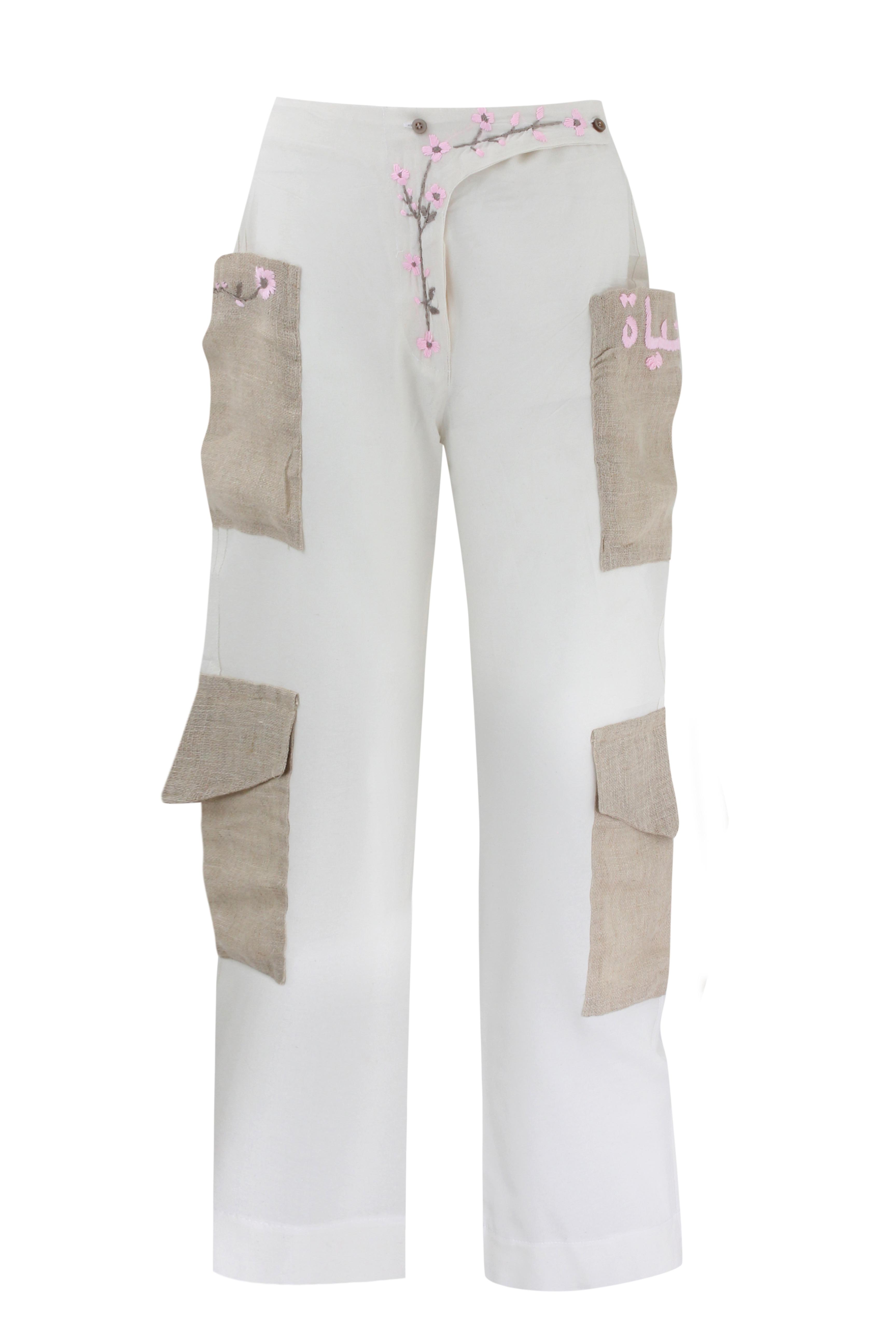 Crafted from organic cotton with raffia pockets, the Arabo Floral Cargo Pants combine function and artistry. Pink floral embroidery runs along the waistband, while one pocket features the Arabic word الحياة (Life), celebrating the In Arabo theme of meaningful words.