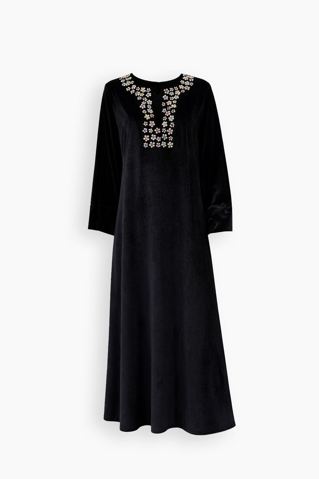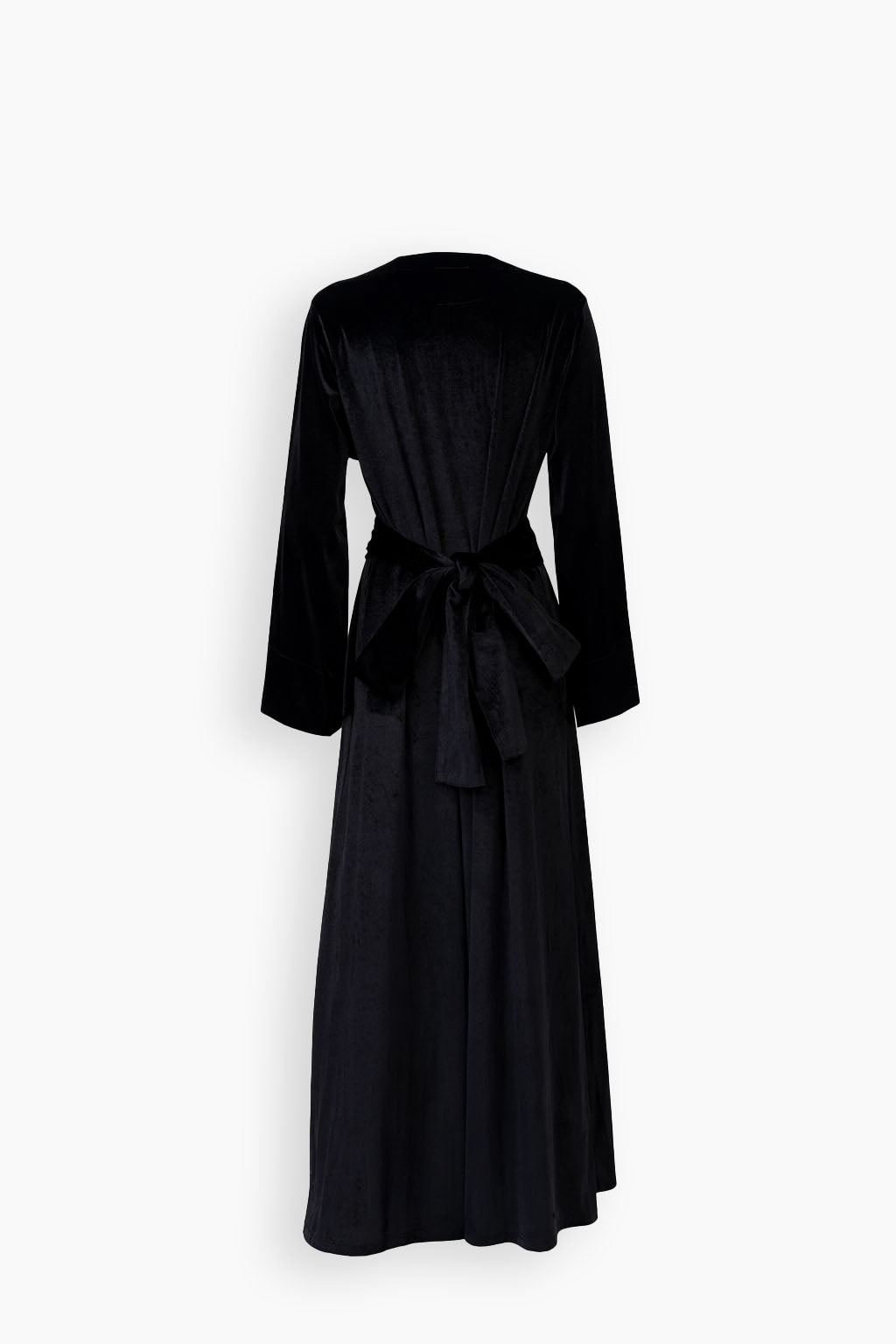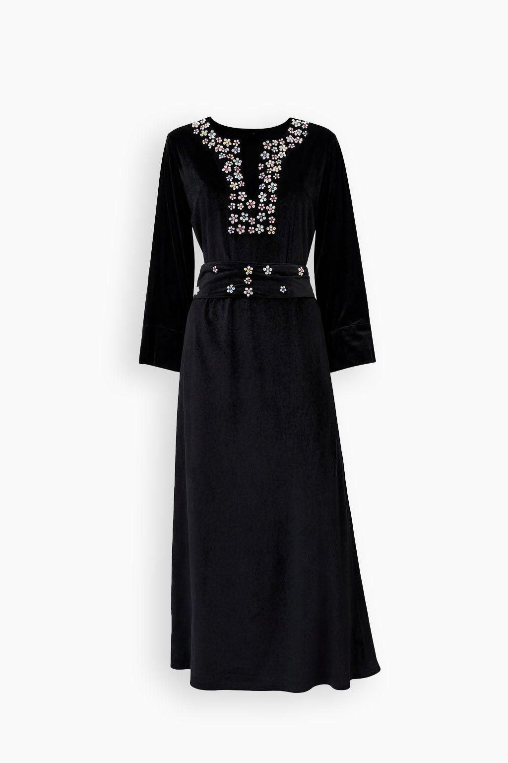 A refined silhouette crafted in soft black velvet, featuring delicate floral crystal embroidery along the neckline, the piece is finished with a matching belt that allows for adjustable styling — worn cinched at the waist or loosely for a relaxed drape.