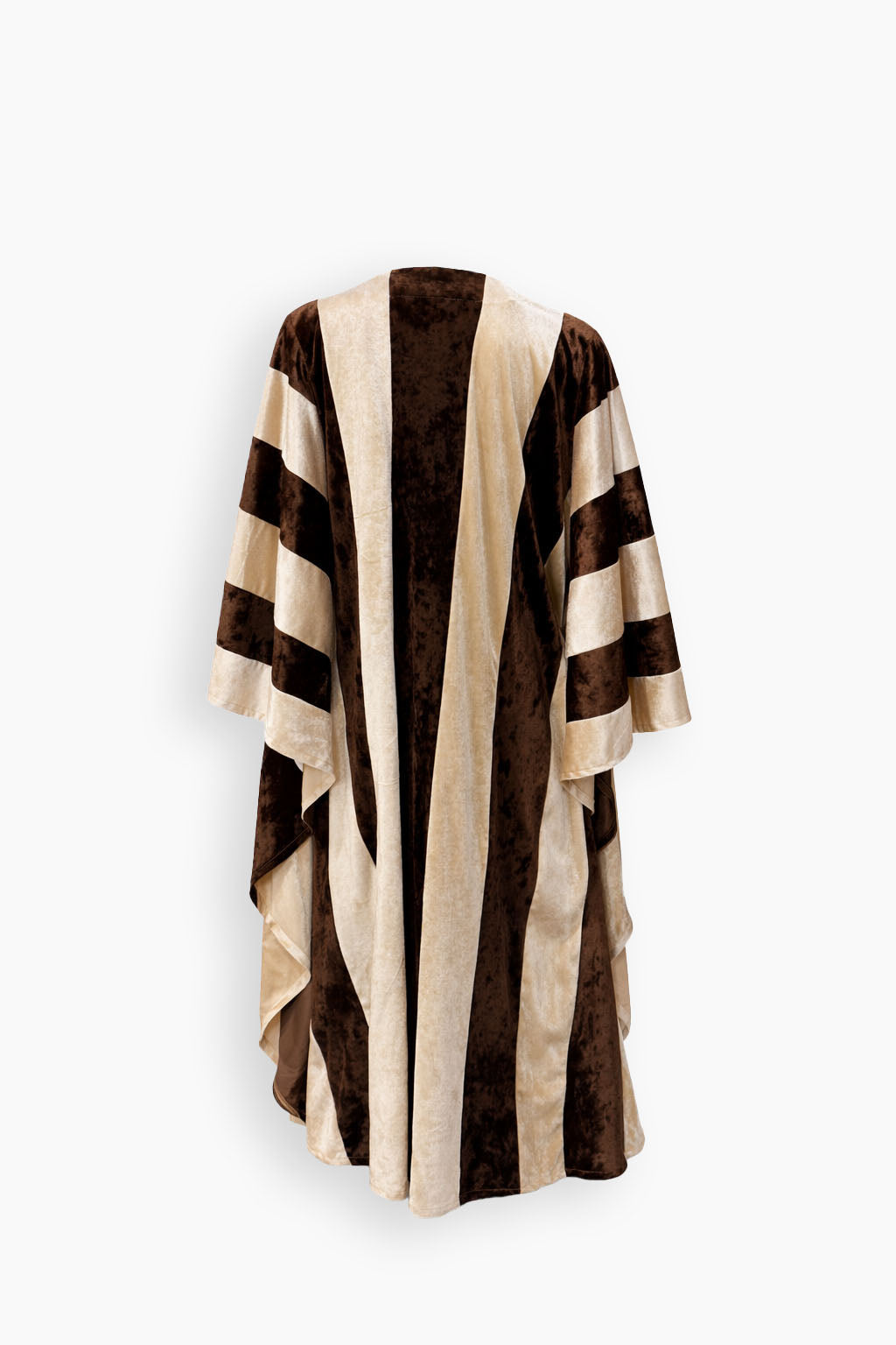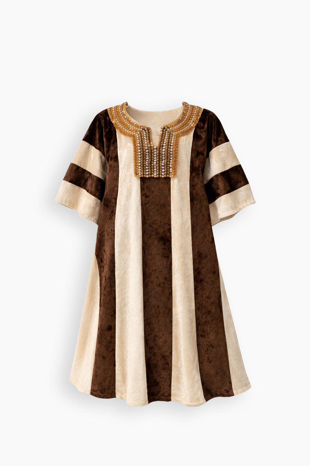 A velvet take on our classic Riga kaftan, reimagined in a softer, fluid silhouette. Crafted in velvet, the design features signature striped panels, a flowing butterfly sleeve, and hand-embroidered beads and crystals at the neckline.