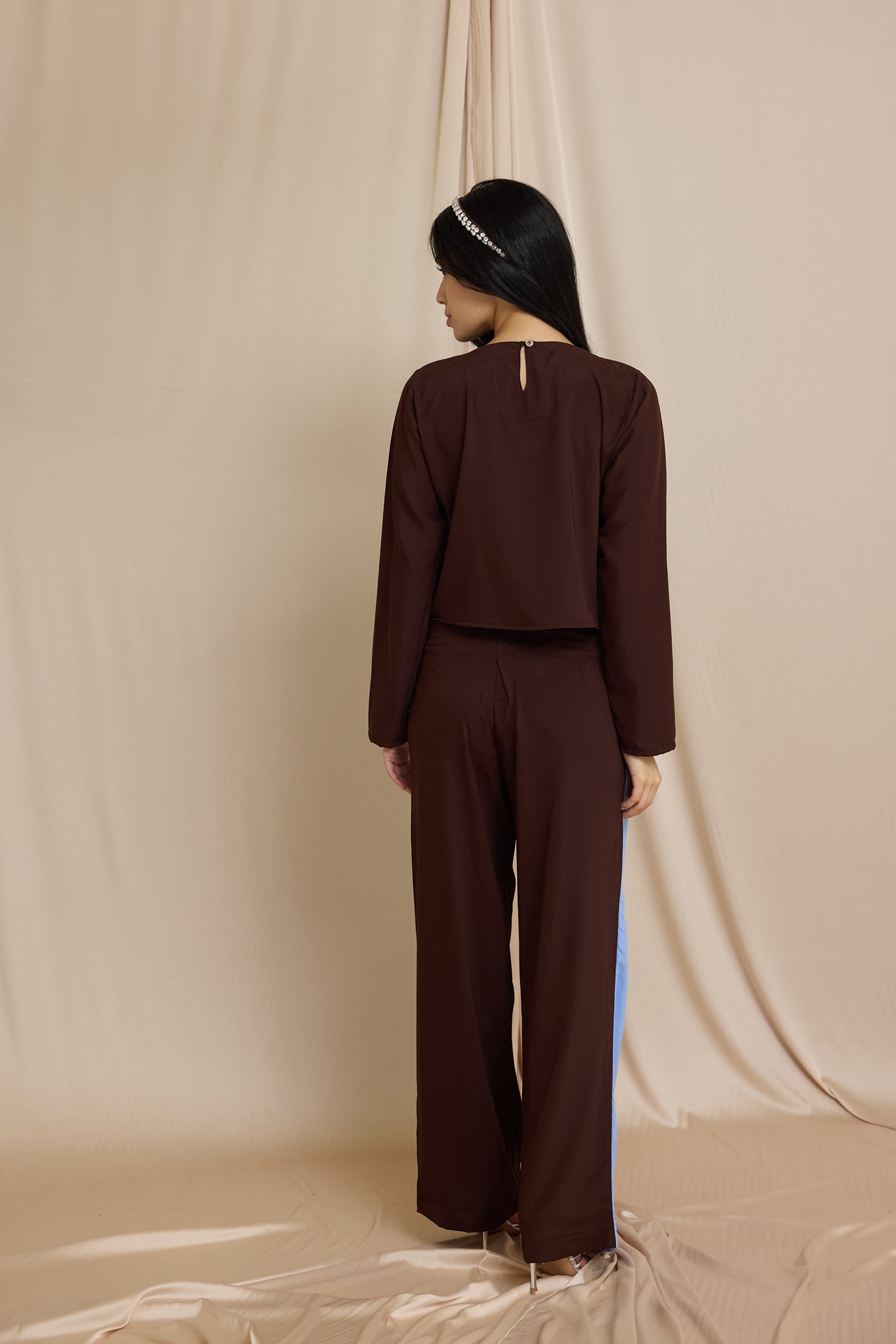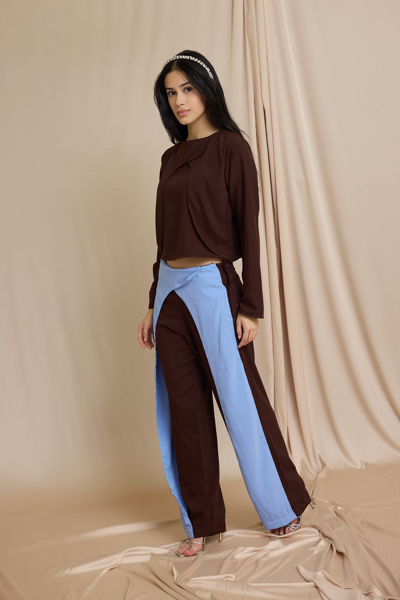 Crafted from soft crepe in contrasting sky blue and deep brown, the Duo Layer Pants feature a unique layered silhouette that flows effortlessly. Designed with an asymmetrical crossover waistband and relaxed fit, they pair perfectly with matching Duo Layer Top.