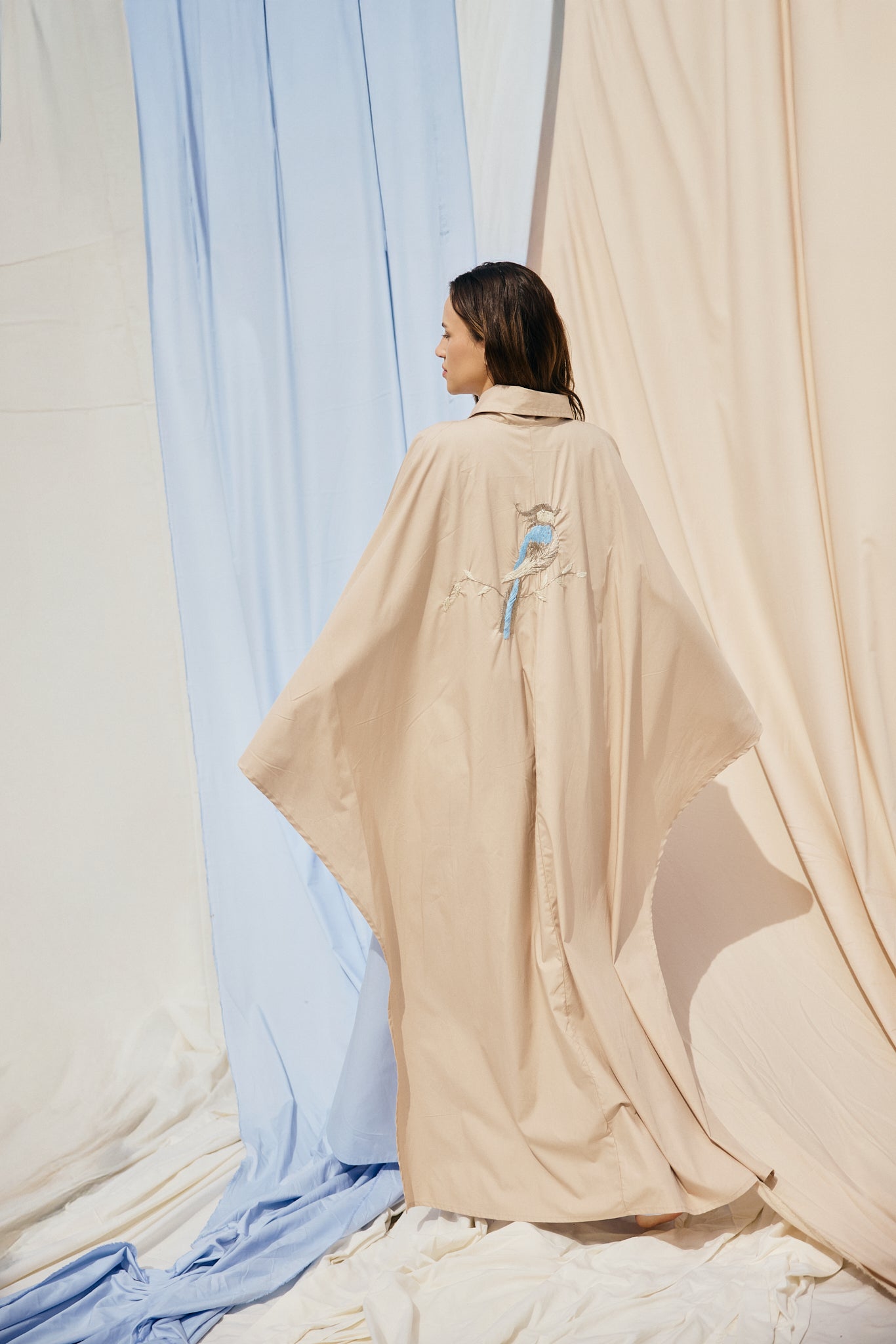 Crafted from poplin cotton in beige and sky-blue tones, this kaftan features a cape-style back with ruched detailing and a hand-embroidered bird motif. Designed with soft contrast layers, it blends structure and ease for a modern, elevated look.