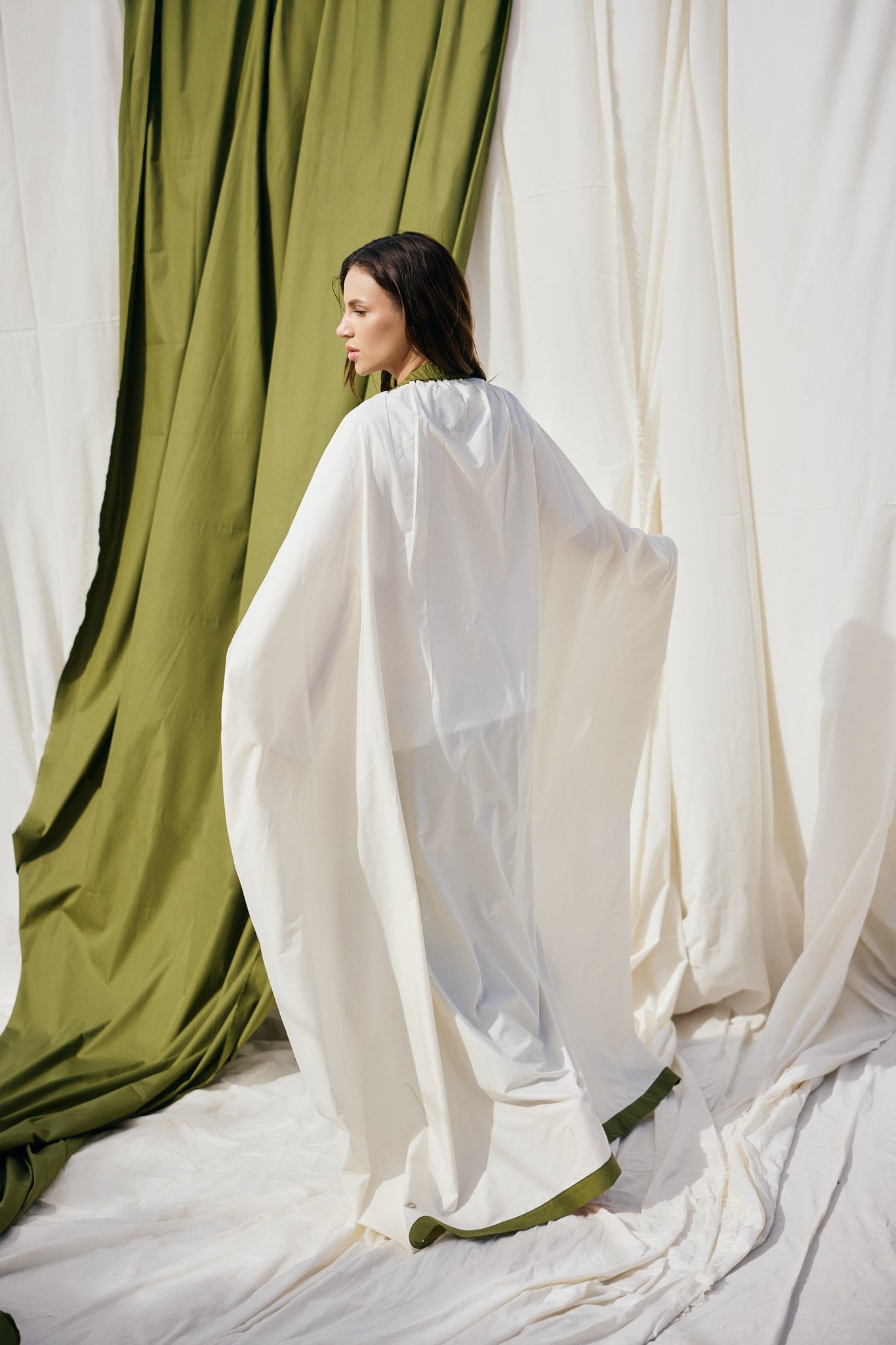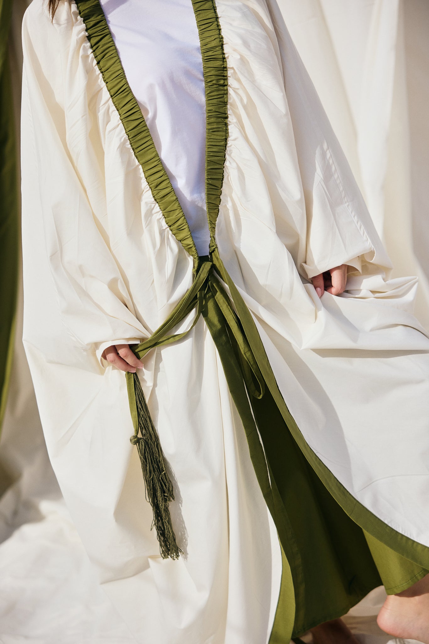 Crafted from poplin cotton in off-white with olive detailing, this kaftan features ruched borders and a front tie finished with handmade tassels. Designed with a relaxed silhouette, it transitions seamlessly from day to evening.