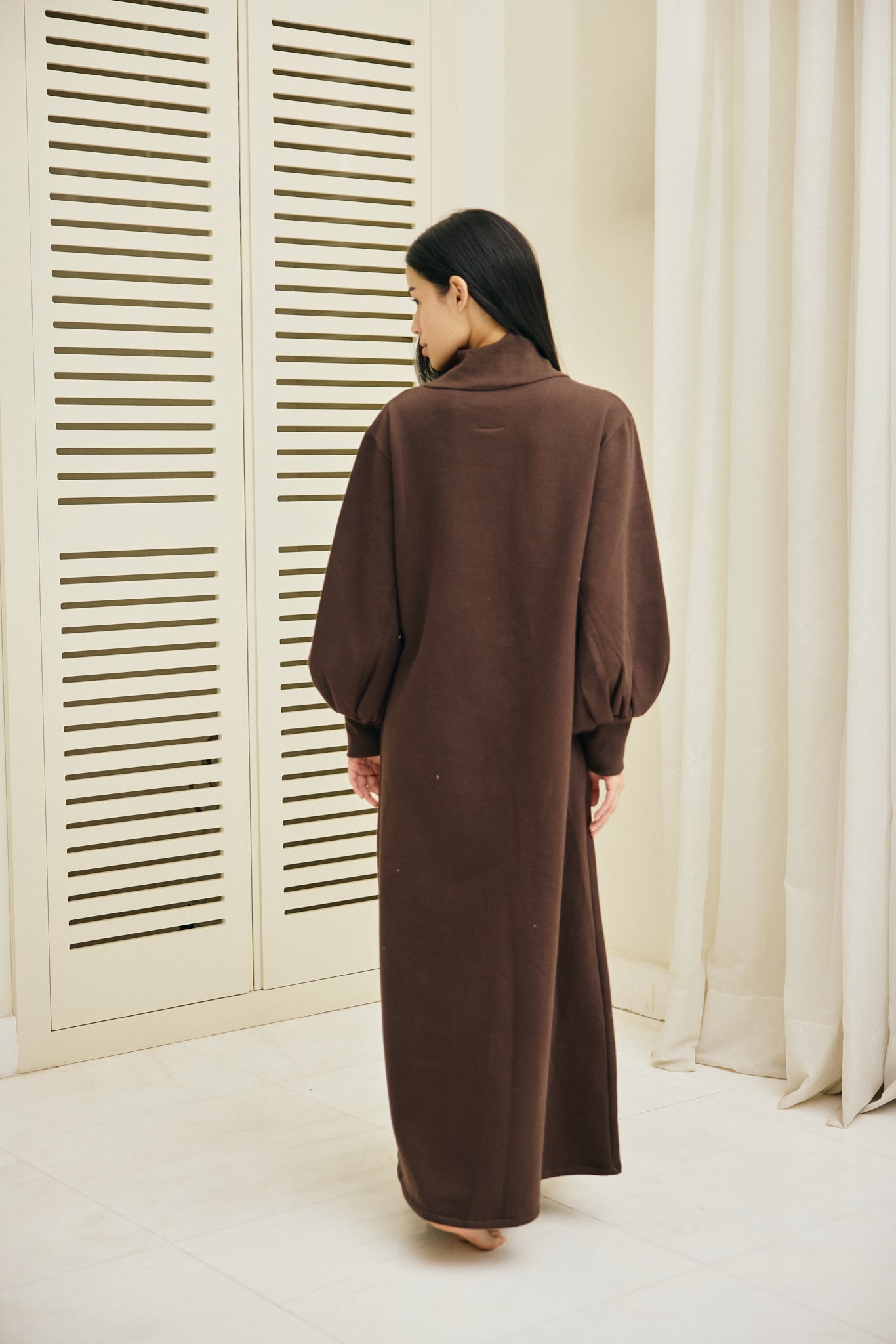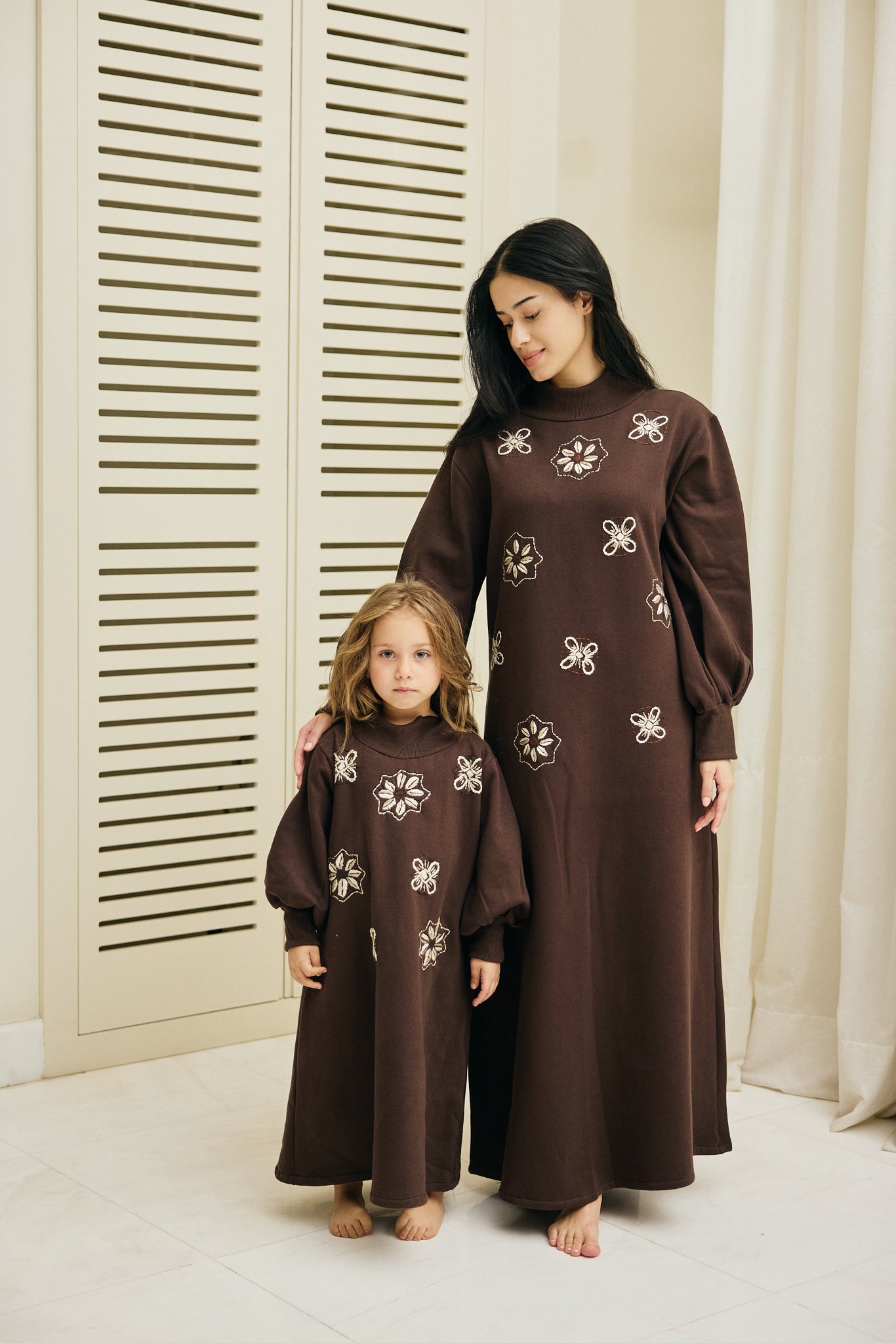 Crafted from soft milton, this dress features a high neckline and cuffed sleeves for a structured silhouette. The front is detailed with hand-embroidered geometric floral motifs in metallic threads, creating a refined statement piece that transitions effortlessly from day to evening.