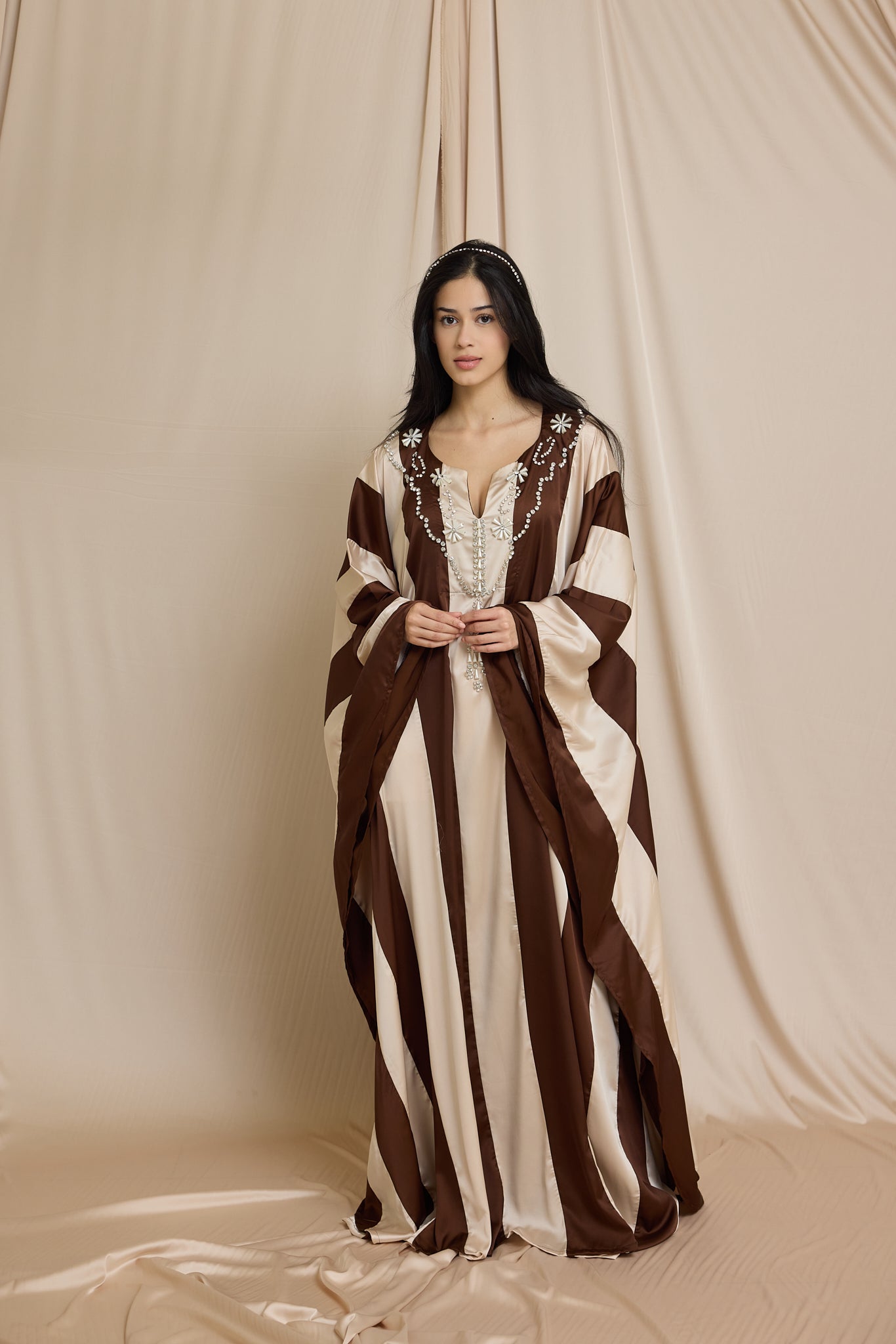 A reimagined take on our classic striped Riga silhouette, the Riga Preziosa Necklace Kaftan combines handmade striped pattern for a striking contrast. The neckline is adorned with our best-selling Preziosa crystal embroidery. Perfect for evening occasions, this piece captures the essence of refined craftsmanship and effortless sophistication.