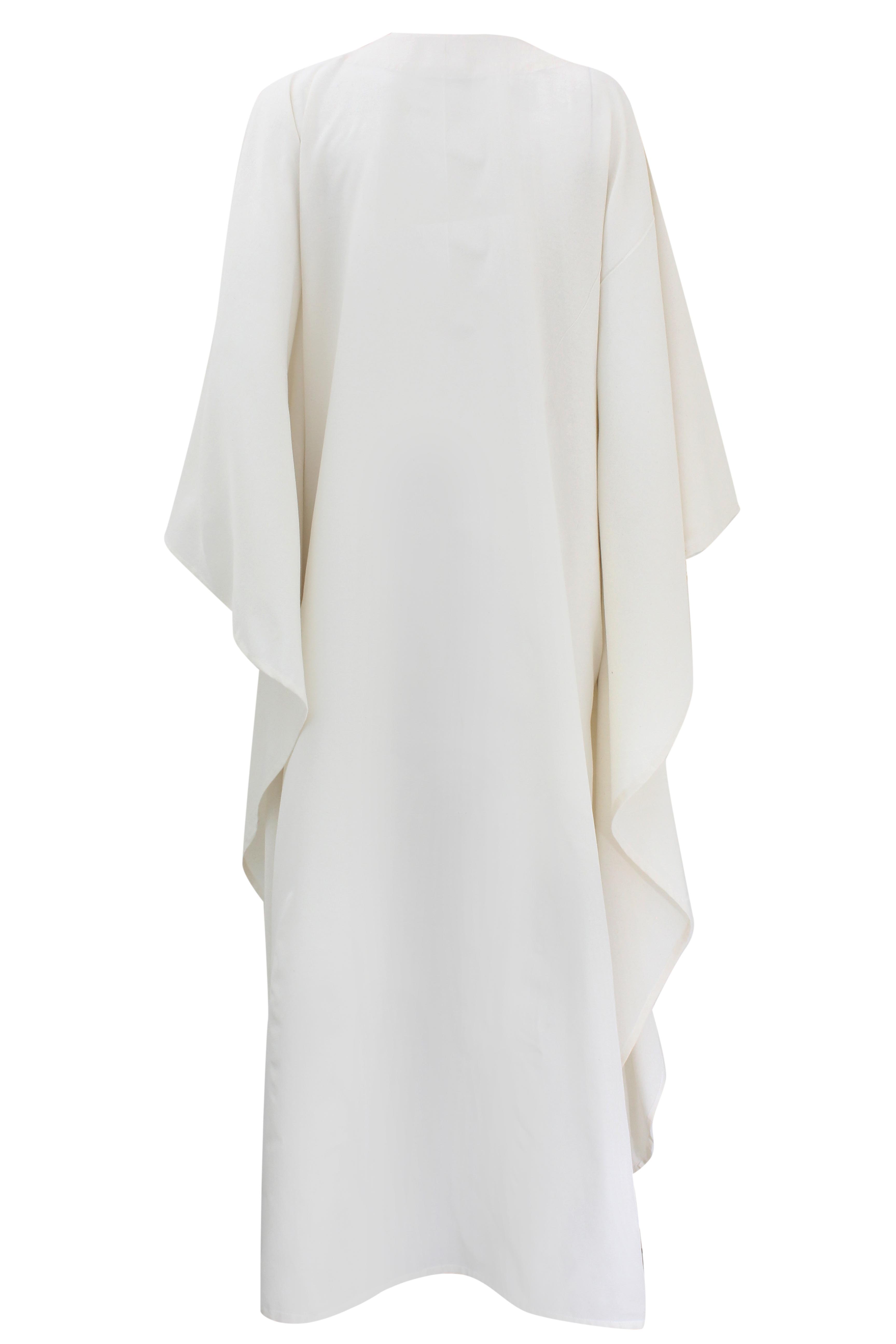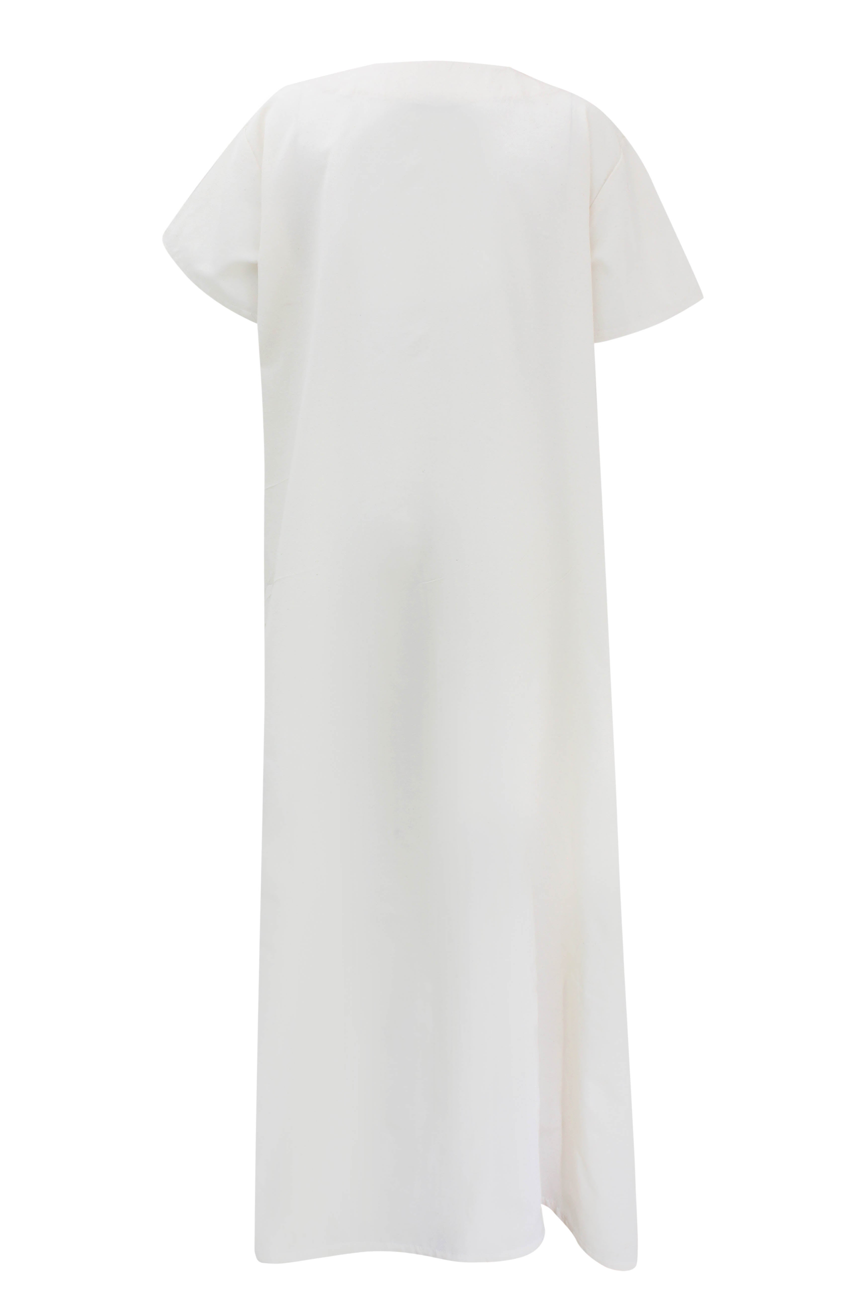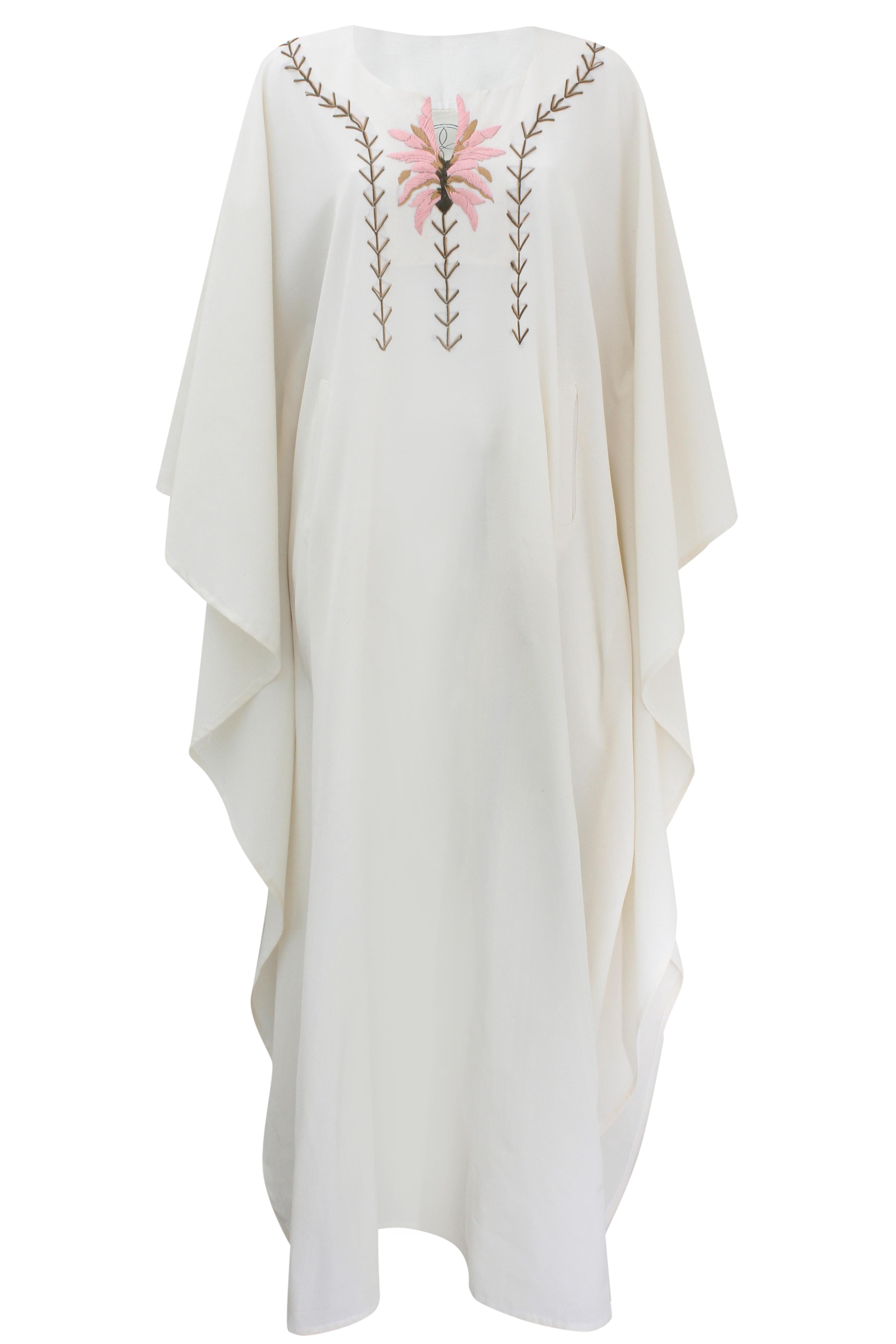 Crafted from organic cotton, the Palma Embroidered White Kaftan features a hand-embroidered palm motif at the chest, framed by stitched detailing along the neckline for a subtle, refined finish. Available in butterfly sleeve, long sleeve, and short sleeve silhouettes.