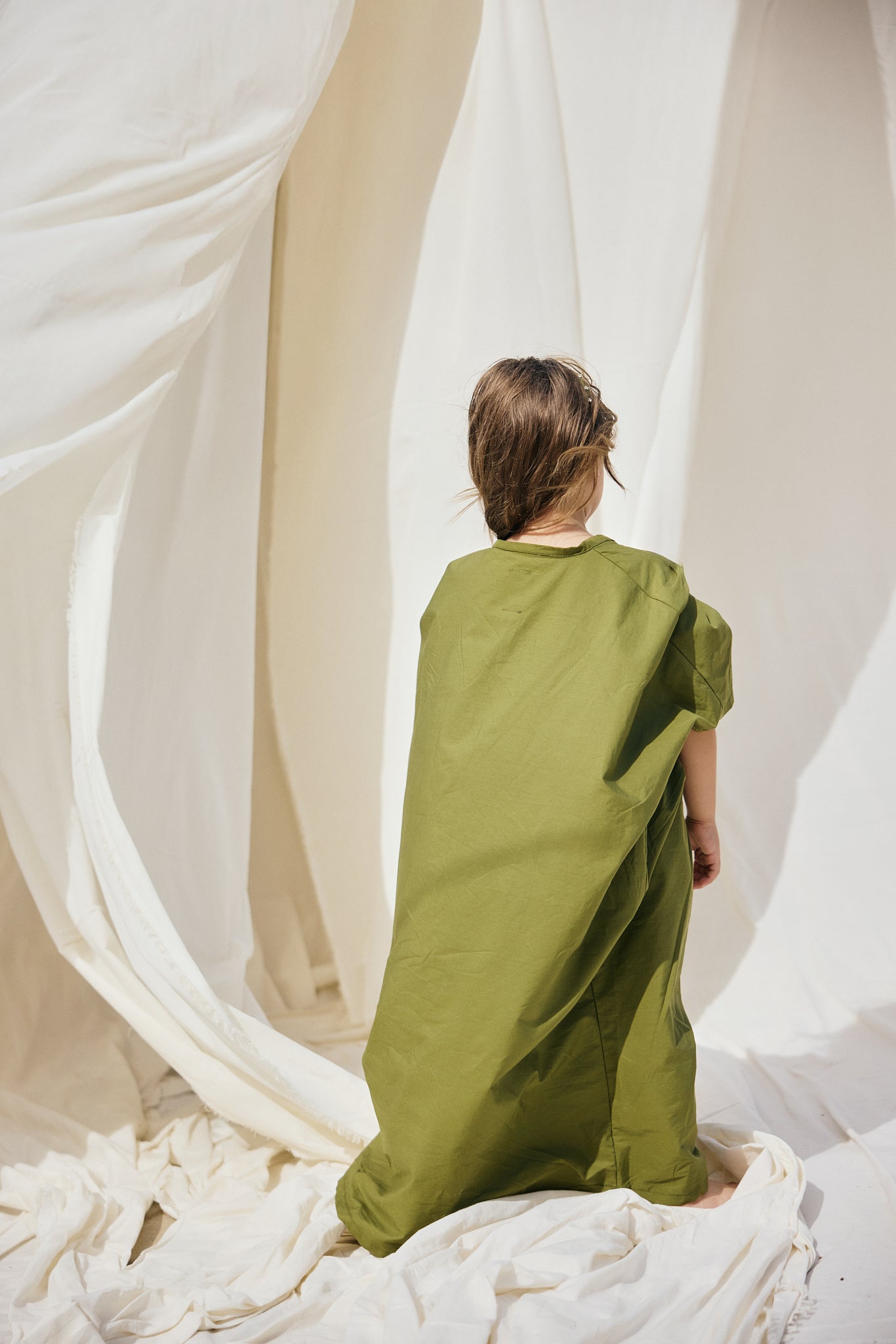 Crafted from olive poplin cotton, the Pleated Floral Kaftan features delicate front pleats adorned with hand-embroidered floral details and subtle crystal accents. Designed with a V neckline, it includes a hidden belt that allows the waist to be cinched or left loose, offering versatile styling for any occasion.