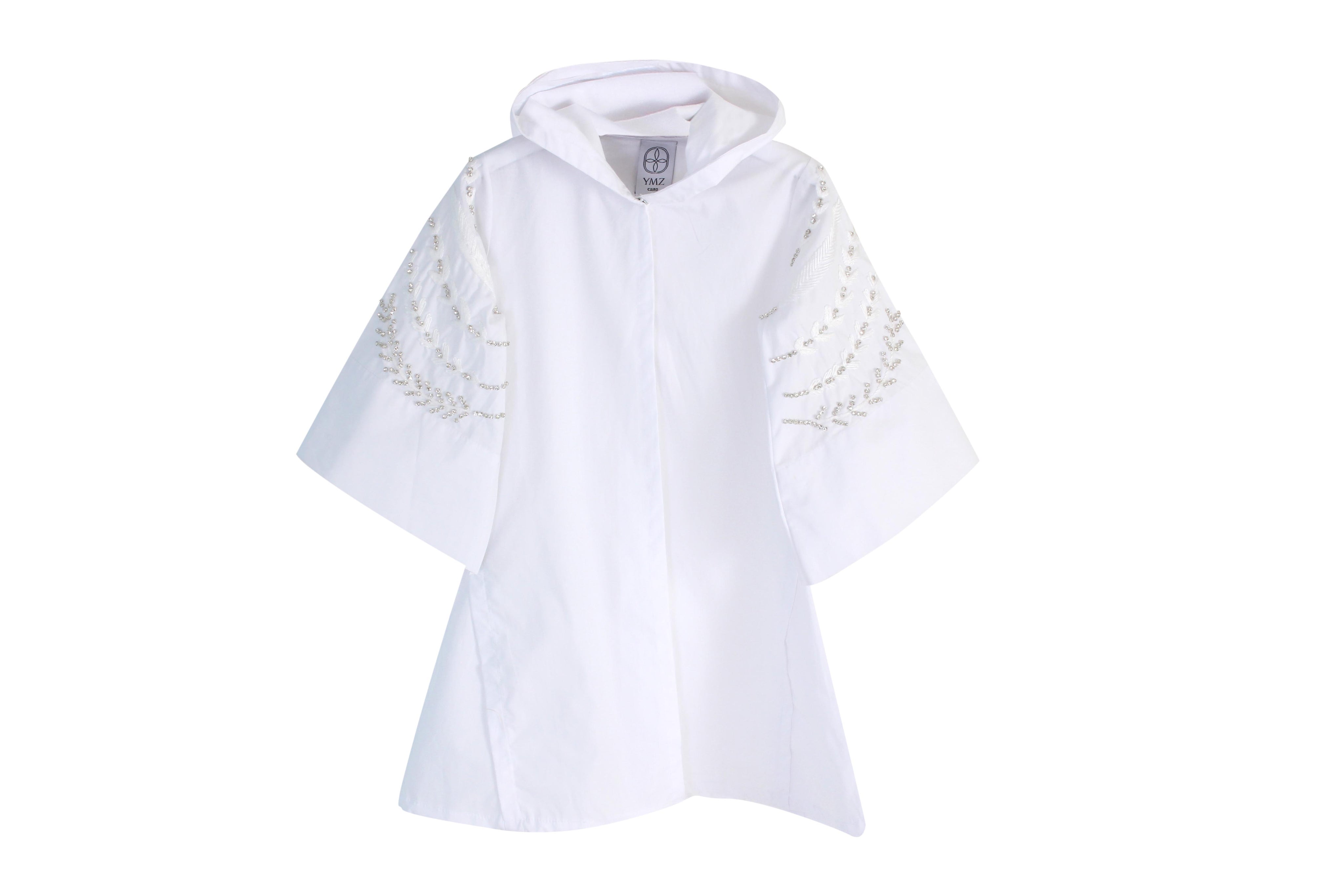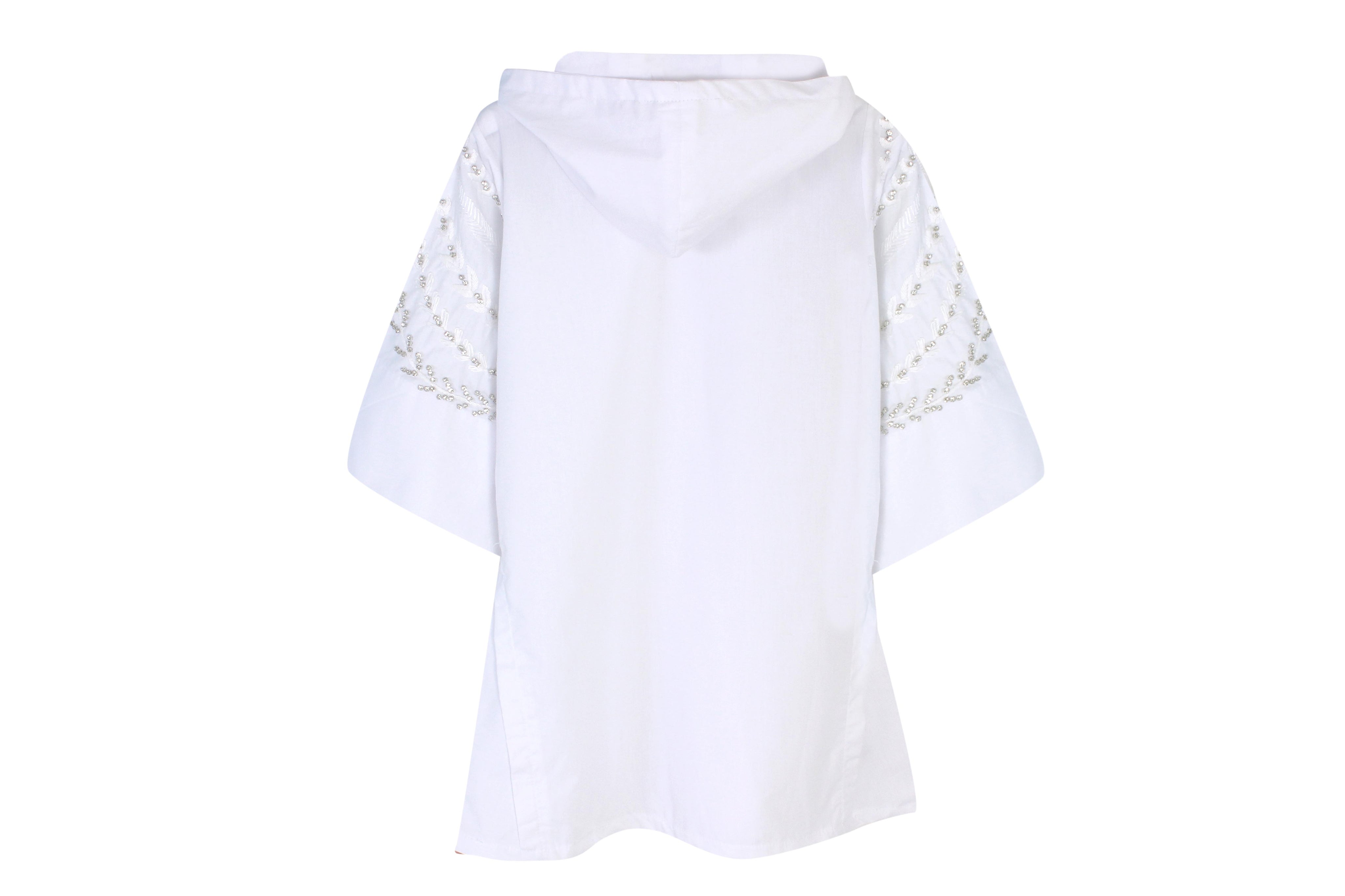 Crafted from premium white poplin cotton, the Preziosa Open Nature White Kaftan features wide sleeves and an open front for effortless elegance. This hoodie-style kaftan is adorned with delicate hand embroidery in white thread, enhanced by subtle rhinestones and silver beading that evoke natural motifs.