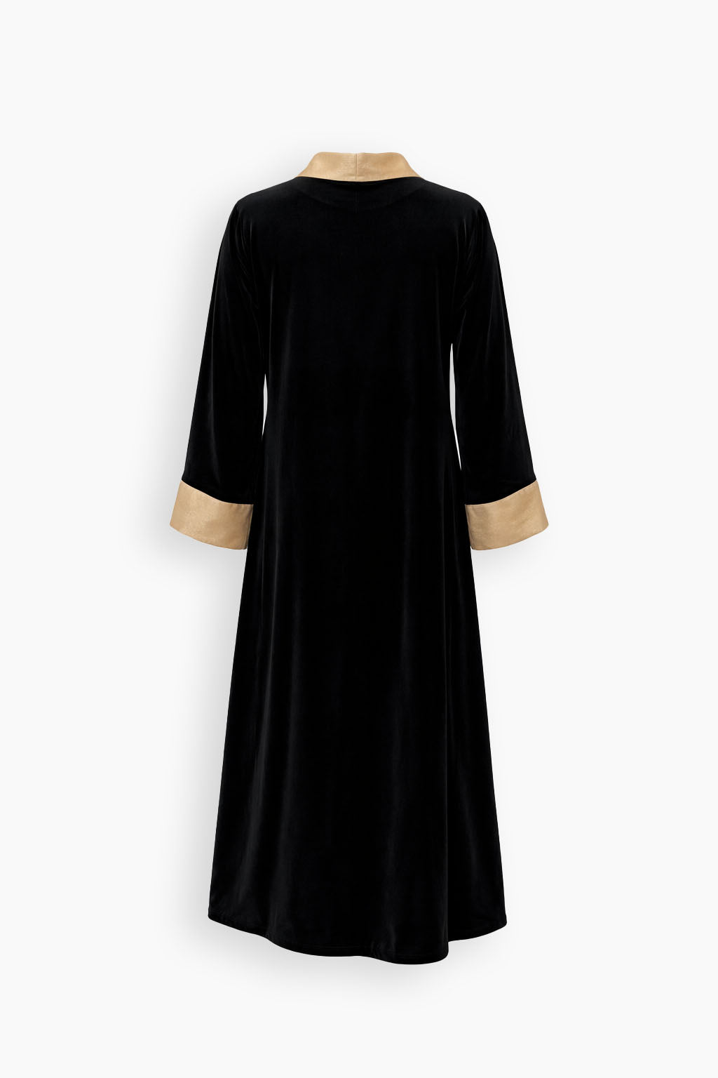 A two-piece set featuring a gold voile underdress paired with an open black velvet kaftan. The outer layer is finished with refined gold voile detailing along the borders and cuffs, creating a subtle contrast against the velvet base.