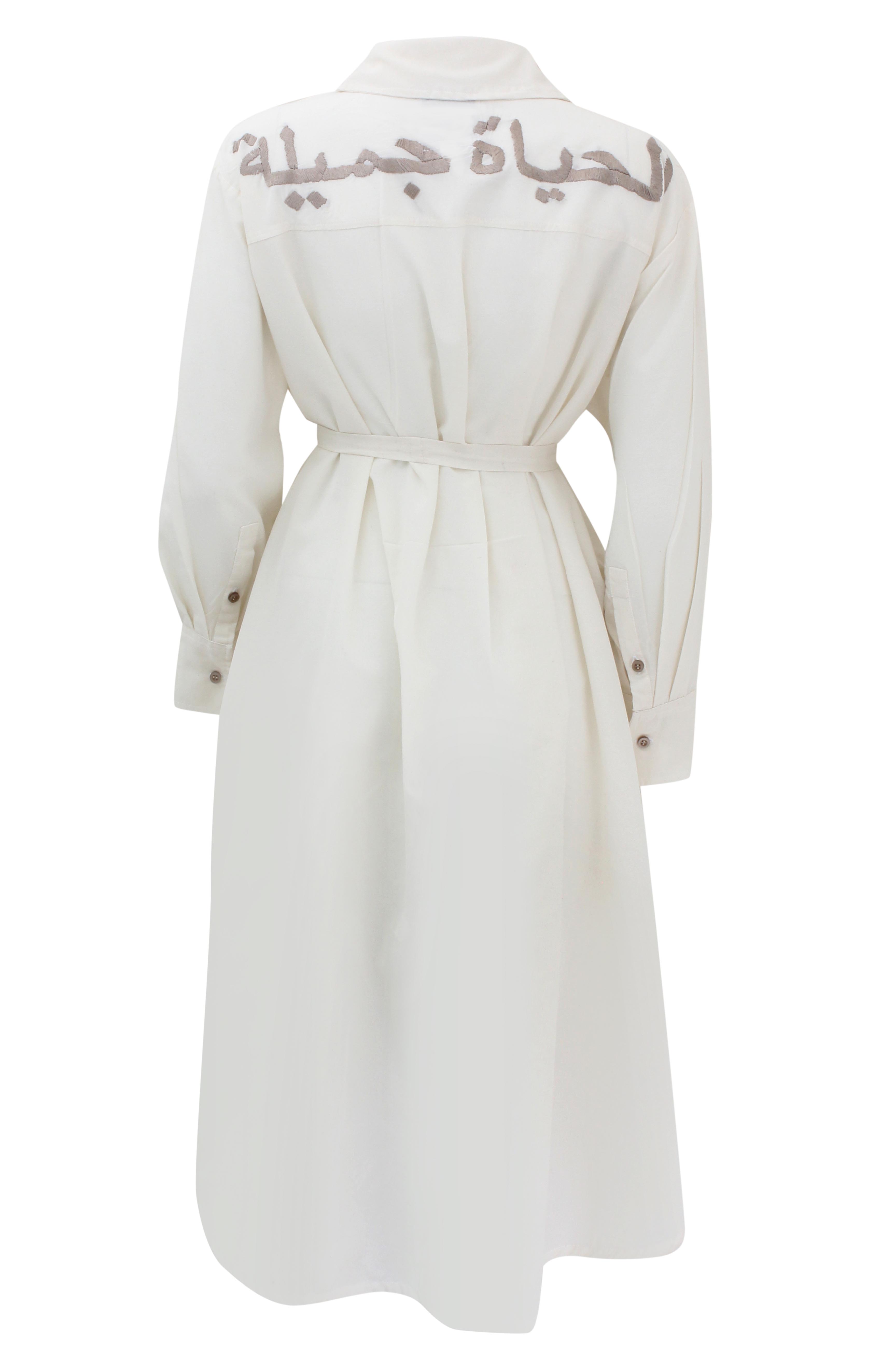 Crafted from organic cotton, the Arabo text Shirtdress features a belted waist and long sleeves for a clean, tailored silhouette. Across the back, hand-embroidered Arabic script reads الحياة جميلة (Life is Beautiful), turning a classic shirt dress into a meaningful statement piece.
