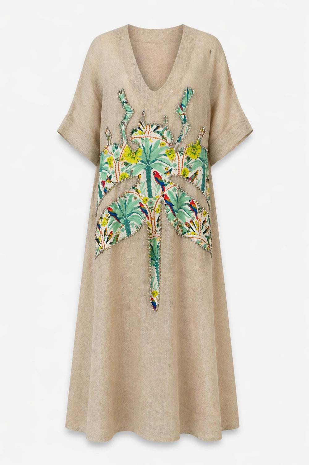 Our Eterna Kaftan is made from premium poplin cotton, with long sleeves, a hoodie and waist tie fastening. This classic piece is enhanced with beautiful hand embroidered crystals alongside the top border and is sure to make a statement.