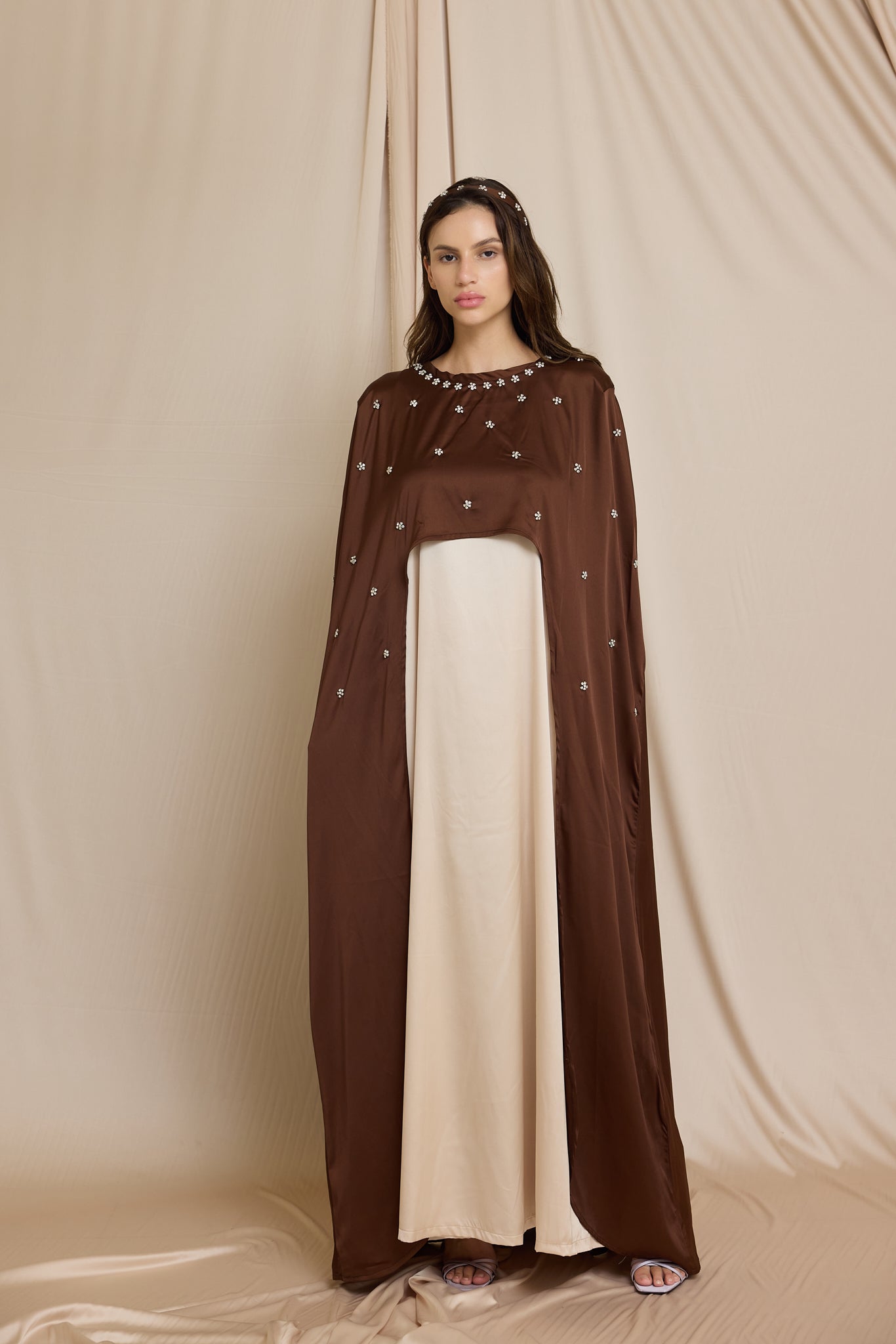 Crafted from satin in deep brown and beige, the Cape Fiore Dress captures understated evening elegance. Adorned with hand-embroidered crystal floral motifs, it drapes effortlessly over the shoulders for a graceful layered look. Perfect for evening occasions designed to make a statement. Paired perfectly with the Fiore Satin Headband.