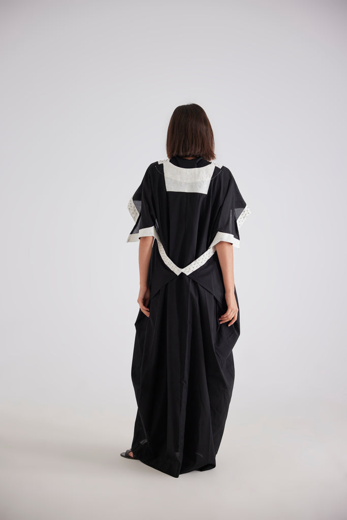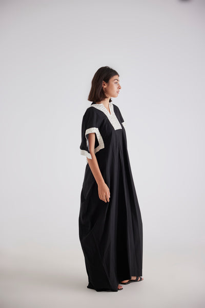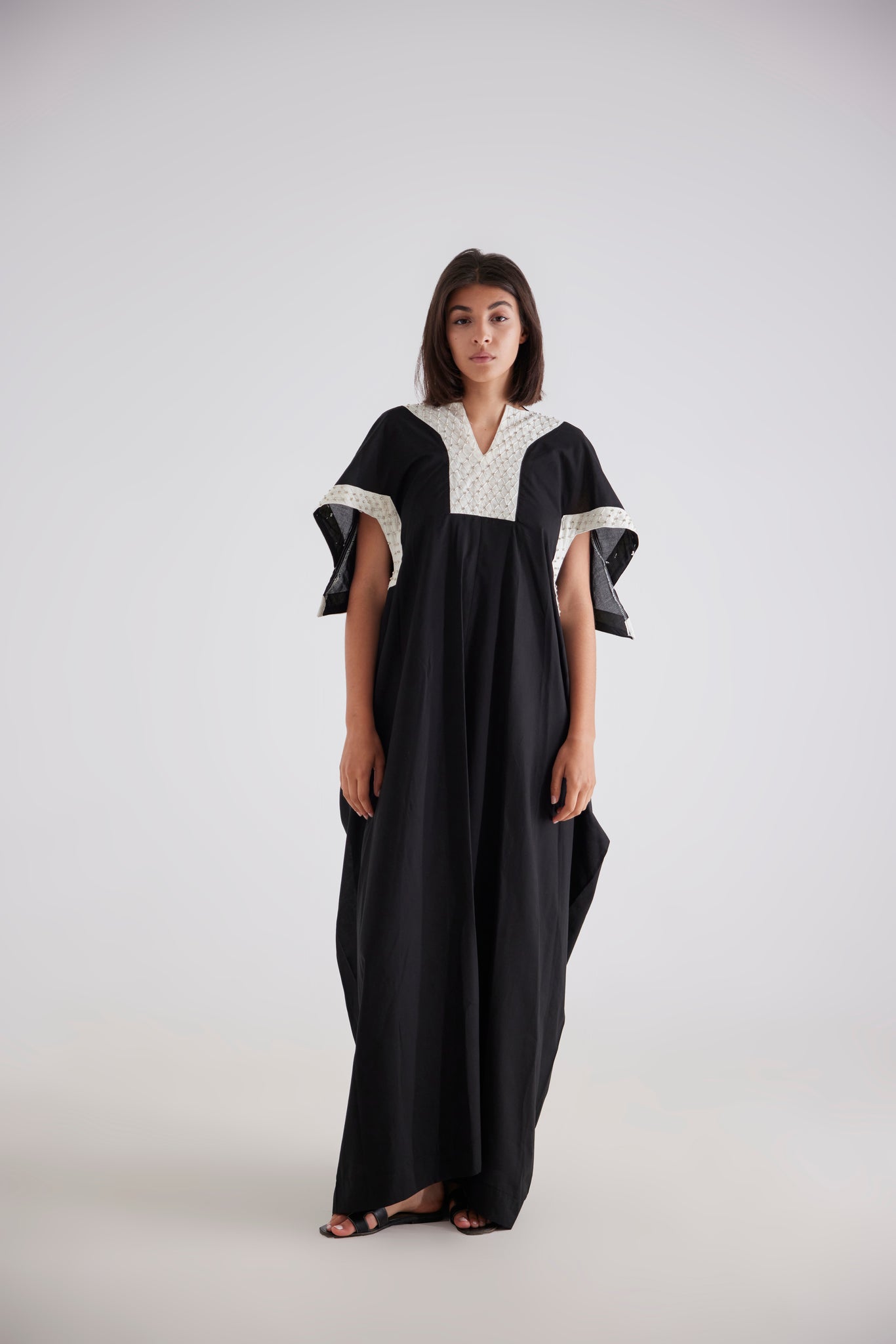 La Rete Lecce Kaftan perfect for day or night. It's wrap design and waist tie fastening provide a breezy fit while raffia inserts add a stunning texture contrast. This poplin cotton kaftan is complete with a timeless v-neckline. Hand embroidered with threads and miniature rhinestone design creating a net effect.