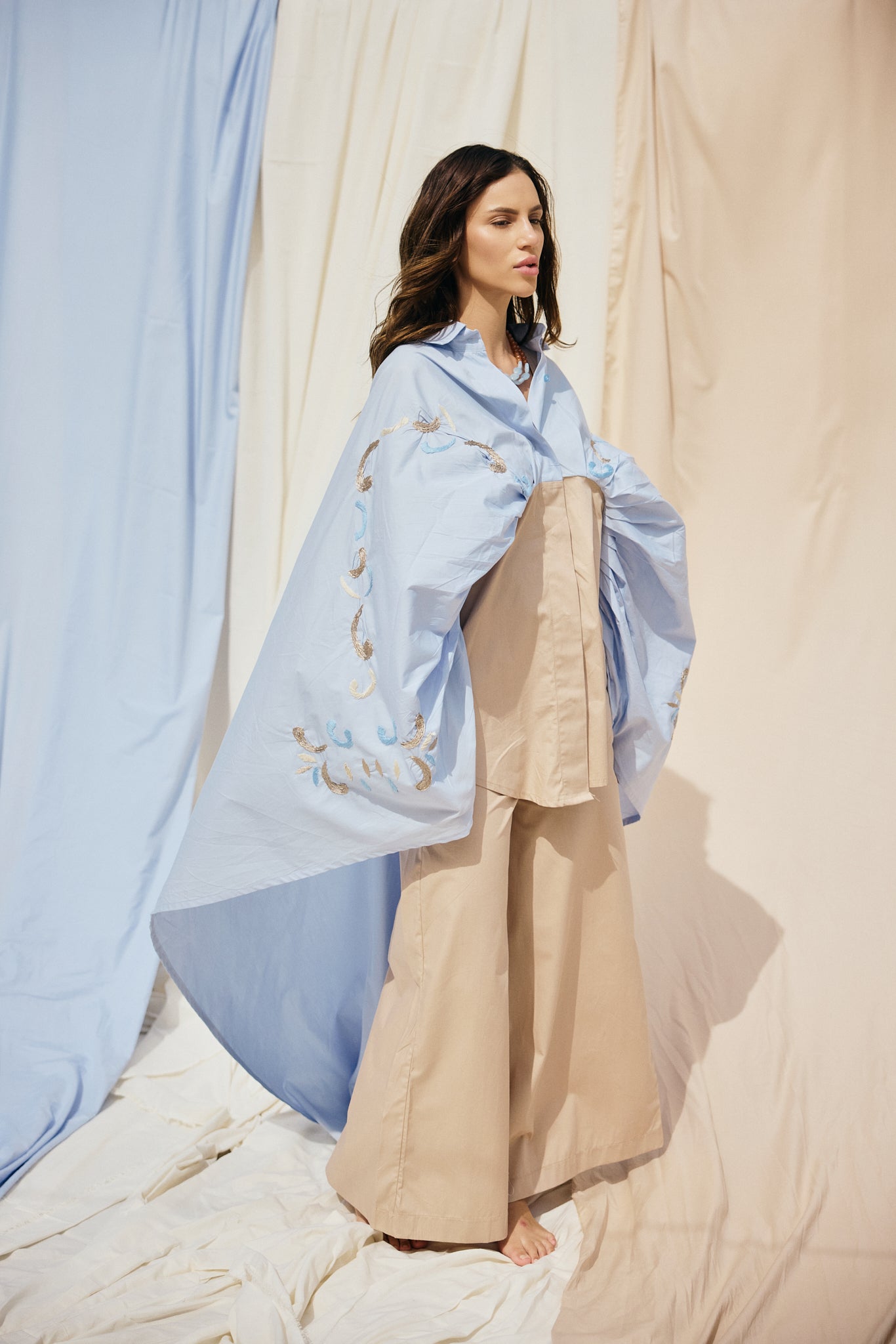 Crafted from crisp poplin in soft beige, the Flare Pants feature a relaxed, wide-leg silhouette that falls elegantly to ankle length. Effortlessly chic and versatile, they pair perfectly with Cape Poplin Preziosa Shirt.
