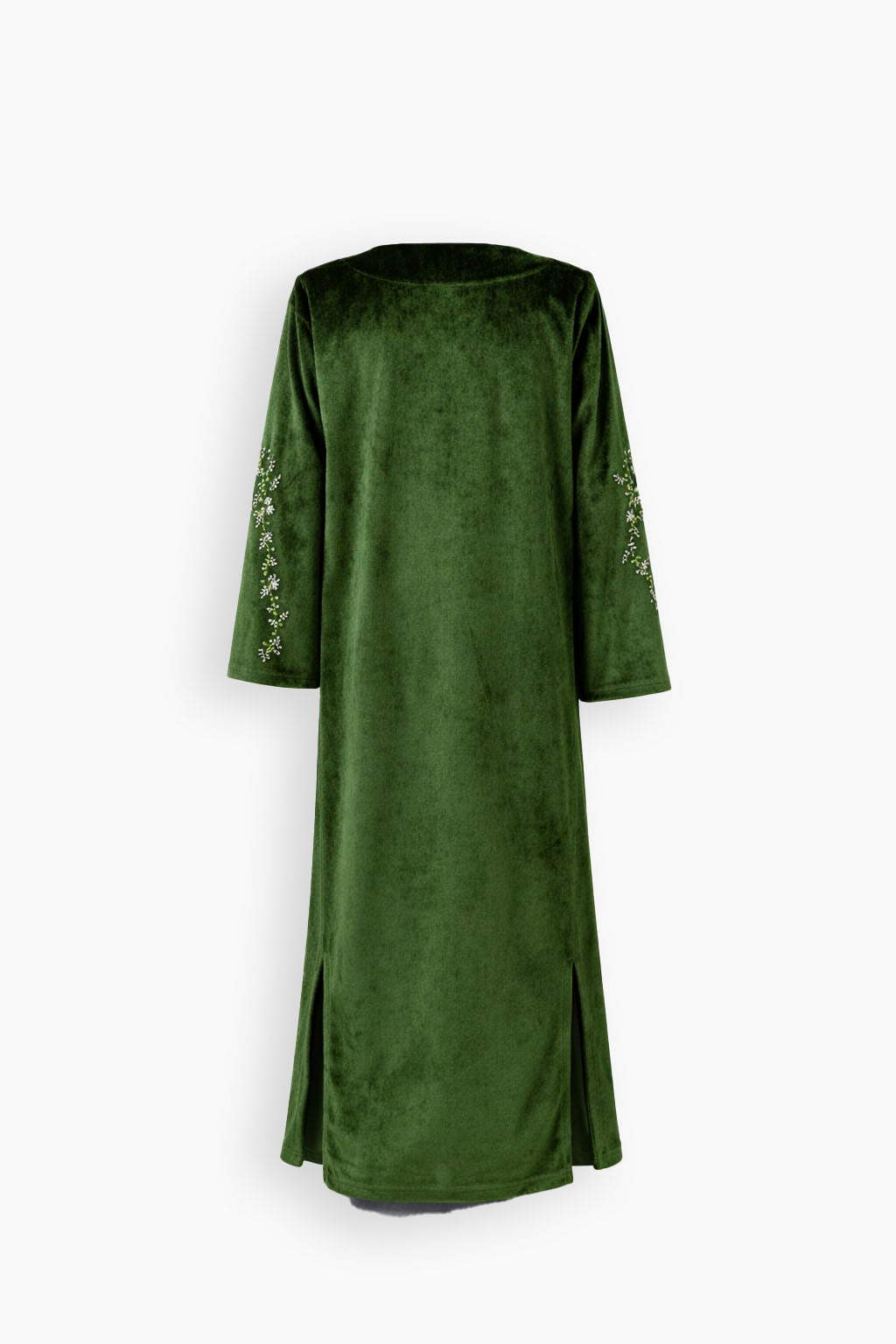 An open velvet kaftan designed with a relaxed silhouette. The piece features an optional capsule closure at the front, allowing for adjustable styling. Finished with hand-embroidered floral detailing along the sleeves, adding subtle texture. Designed as a versatile layering piece.